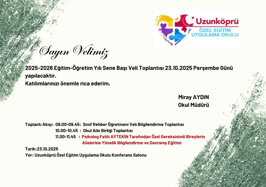 2025-2026 Eğitim-Öğretim Yılı Sene Başı Veli Toplantısı, Okul Aile Birliği Toplantısı ve Psikolog Fatih AYTEKİN tarafından Özel Gerekinimli Bireylerin Ailelerine Yönelik Bilgilendirme ve Davranış Eğitimi Semineri 23.10.2025 Perşembe Günü gerçekleştirilecektir.